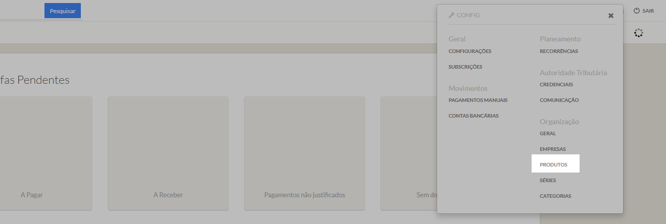 Passo 1 – Clique em Config presente em todas páginas no canto superior e depois clique em Produtos.