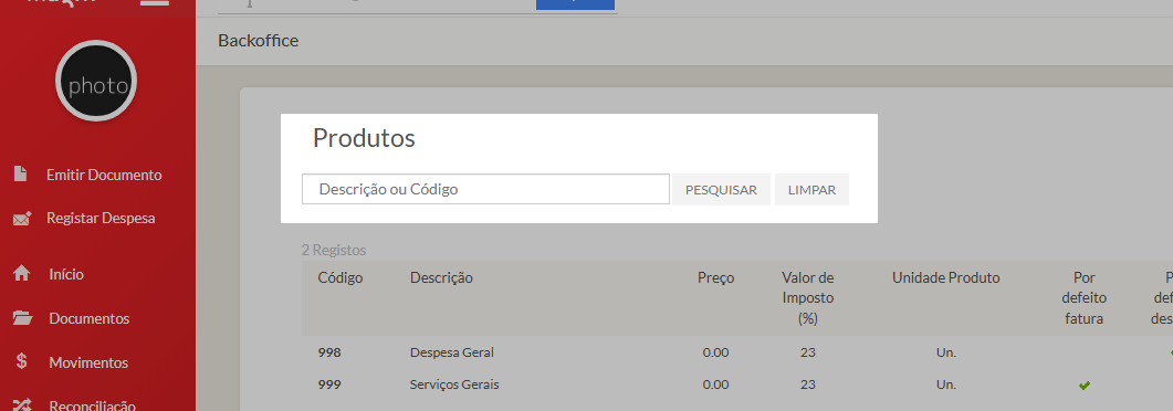 Por exemplo, se colocar “30” serão apresentados todos os resultados que contenham esta sequência de caracteres quer na descrição quer no código.