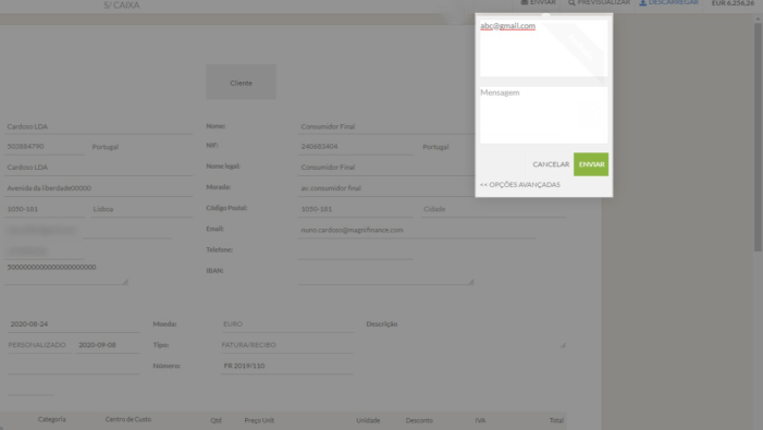 Quando enviar documentos por e-mail para os seus clientes poderá acrescentar uma mensagem à mensagem standard que é enviada com todos os documentos.